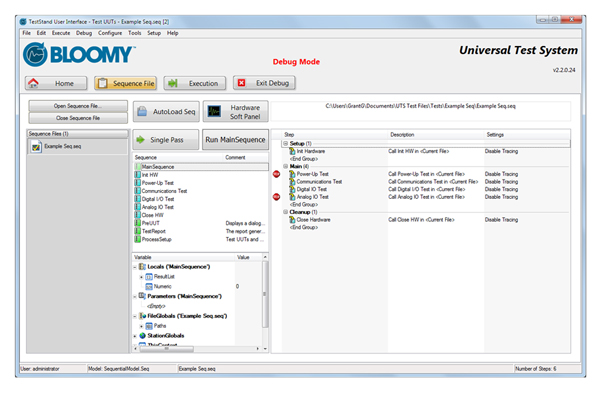 Sample Debug Interface screen showing some of the advanced debugging capabilities of the OI. Debugging capabilities include setting breakpoints, running selected steps, skipping steps, and single stepping through a sequence.